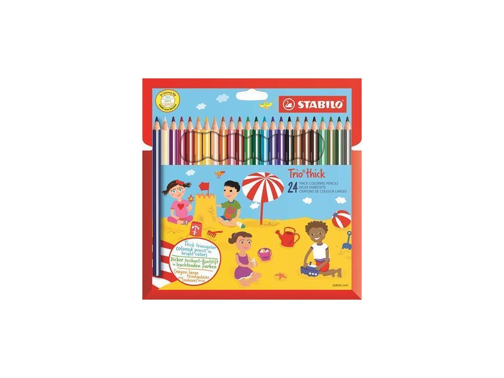 Barevné pastelky "Trio thick", sada, 24 různých barev, silné, trojúhelníkový tvar, ořezávátko, STABI