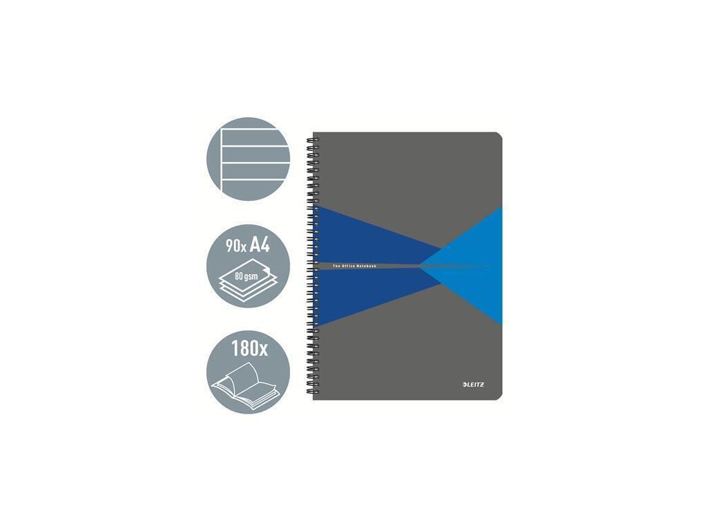Blok "Office", šedo-modrá, drátěná kroužková vazba, A4, linkovaný, 90 listů, plastový povrch, LEITZ