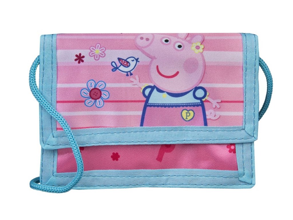 Dětská textilní peněženka s motivem Prasátko Peppa na suchý zip se šňůrkou za krk. Vzadu je uzavíratelná kapsička na drobné. Materiál 100% polyester.Doplňkové parametry