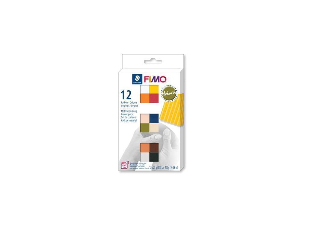 Sada NATURAL obsahuje:12 půlbloků FIMO Soft 25 g - bílá, okrová, tmavě červená, modrozelená, oranžová, tělová, olivová zelená, béžová, čokoládová, koňak, šedá, černá