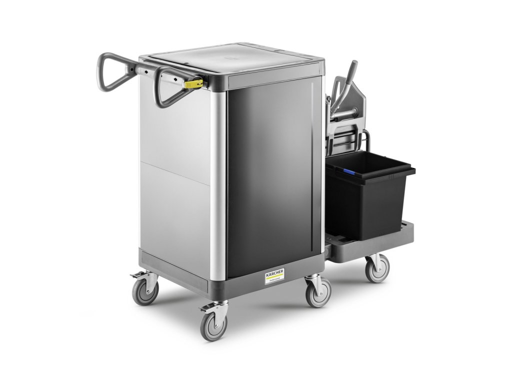 Uzavřený a kompaktní úklidový vozík FlexoMate ExpertPro 50/W Tp je ideálním řešením pro malé skladovací prostory. Poskytuje dostatek prostoru pro kbelíkovou metodu s univerzálním lisem (s jedním kbelíkem na čerstvou vodu a jedním na špinavou vodu). Když se nepoužívá, lze prodlužovací panel složit, aby se ušetřilo místo. Dva kbelíky, každý o objemu 6 litrů, nabízejí oddělený prostor pro všechny druhy úklidového náčiní. Dvě 16litrové výsuvné zásuvky lze umístit podle požadavků, ideální pro přenášení dalšího vybavení. Pomocí dodaných přípojek FlexoLink lze mopové systémy, chapadla a další předměty podle potřeby snadno připevnit na vnější stranu FlexoMate. FlexoLink XL lze v případě potřeby použít k připojení výstražného štítku nebo WVP 10 Adv. Brzdy jsou k dispozici na dvou ze čtyř kol vozíku,to zajišťuje stabilitu za všech okolností i na svažitém terénu. Díky ergonomicky tvarované a výškově nastavitelné rukojeti FlexoGrip se snižuje namáhání paží a ramen při tlačení vozíku. Dveře push-to-open lze navíc podle potřeby upravit pro praváky i leváky. Základní výbava: 2x 15l kbelík, 2x 6l kbelík, 2x 16l šuplík, 1x přídavný zásobník, 1x odnímatelný díl 2x70L, 2x FlexoLink S, 1x FlexoLink XL