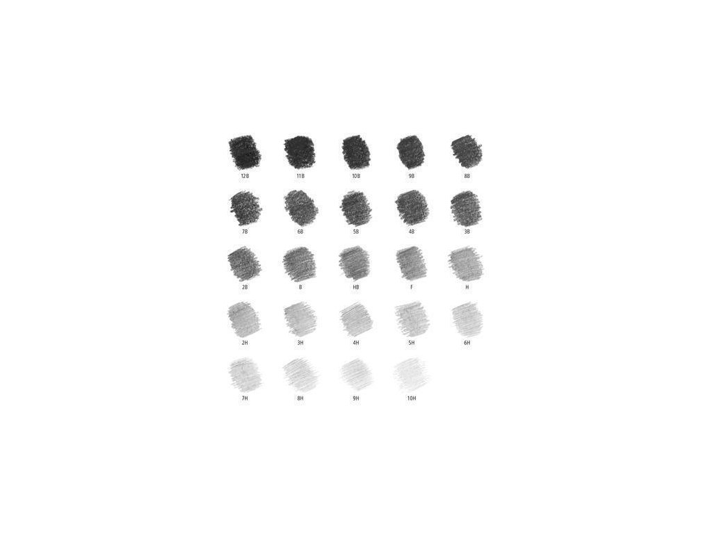Průměr tuhy: 12B: cca. 4,5 mm, 11B-6B: přibl. 3,6 mm, 5B-3B: Přibl. 2,5 mm, 2B-10H: přibl. 2,0 mm