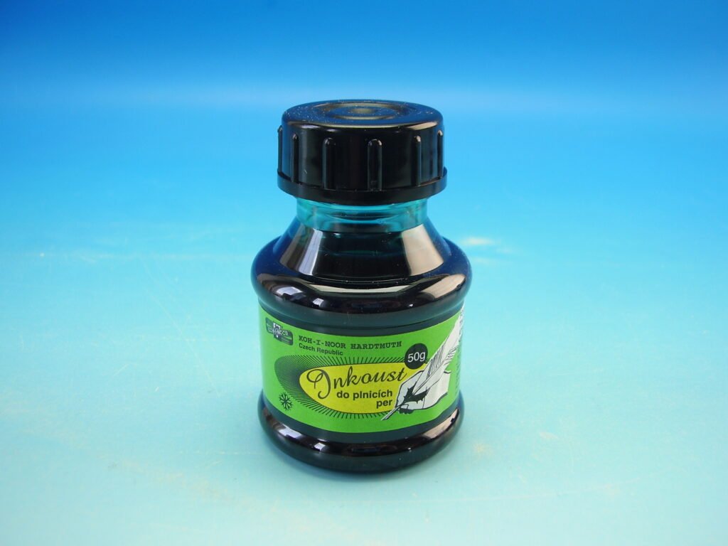 Zelený inkoust balený v 50 g plastové lahvičce určený do plnicích per a sloužící pro ruční psaní na papír.