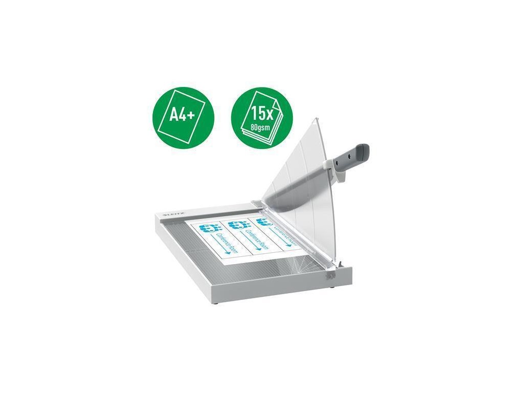 Výkonná a robustní řezačka papíru A4+ ideální pro běžné kancelářské použitíVysoce kvalitní čepel z nerezové oceli rozřeže až 15 listů papíru o gramáži 80 g/m2 nebo jiných materiálů, jako jsou štítky, fólie, fotografie, lamináty, karty a lepenky