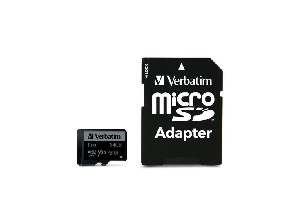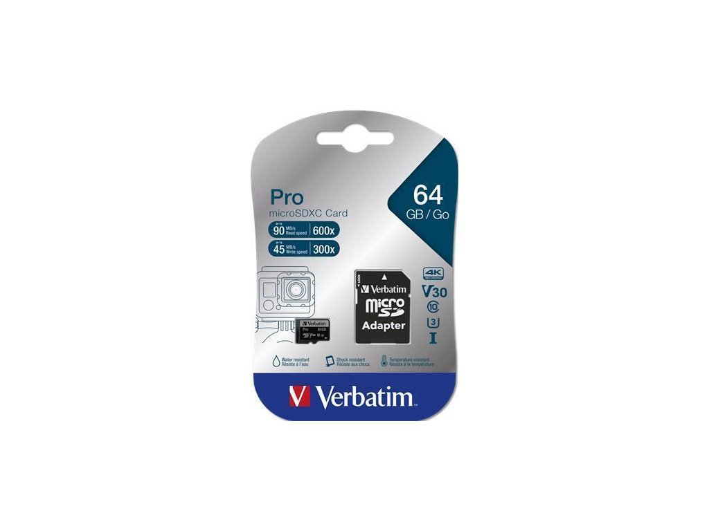 Paměťová karta "PRO", microSDXC, 64GB, CL10/U3, 90/45 MB/s, adaptér, VERBATIM