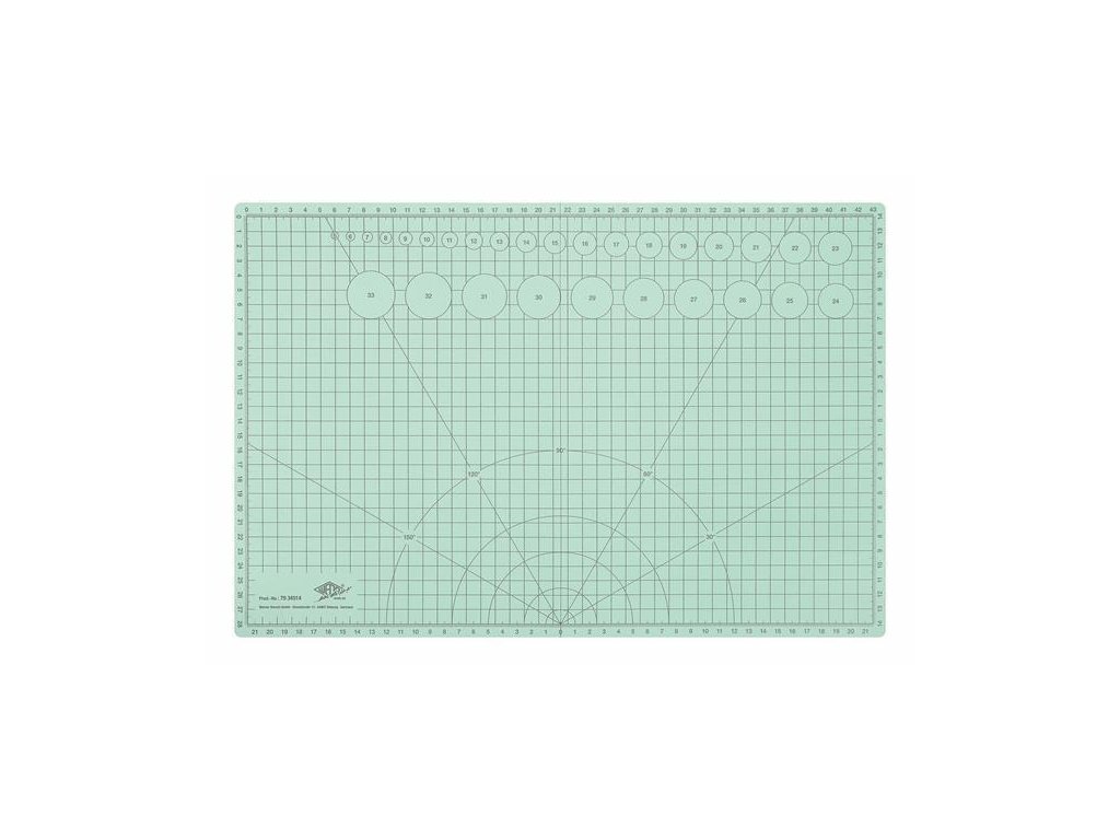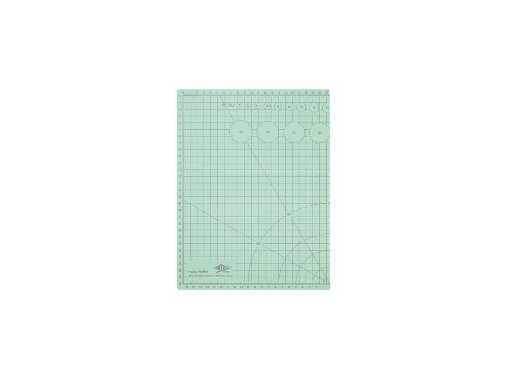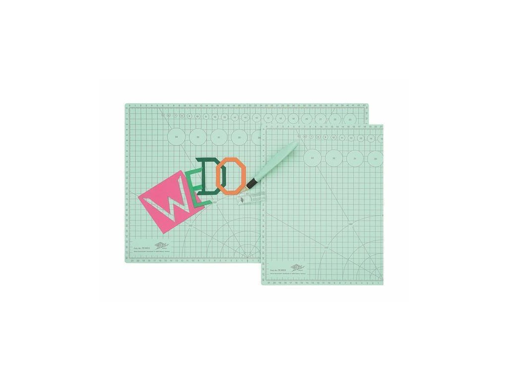 Skládací řezasí podložka ve velikosti A3/A4. Podložka je uprostřed skládací, a proto prostorově úsporná, velmi univerzální a individuálně použitelná. Snadno můžete přeměnit velkou podložku na středně velkou. Je potištěna na jedné straně mřížkou cm, různými úhly a kruhy. Třívrstvá konstrukce se speciálním vnitřním jádrem a samozavíracím povrchem umožňuje přesné řezy a zachovává ostrost čepele.Velikost: 45 x 30 cm (A3), tloušťka: 3 mm, měřítko 43 x 28 cm, skládací na A4.