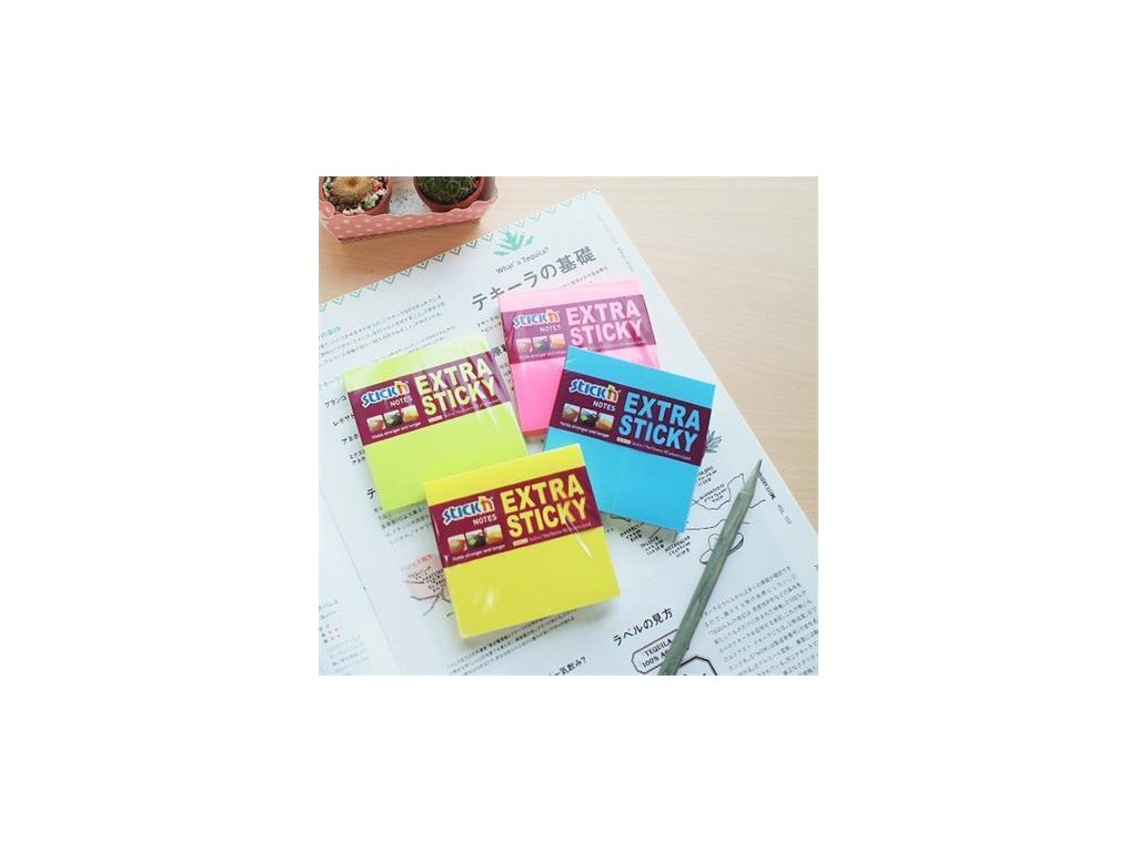 Samolepící poznámkový blok Extra Sticky poskytuje silnou přilnavost ke většině povrchům (plastu, lepence, sklu, papíru a mnoha dalším povrchům).neonově žlutá barva