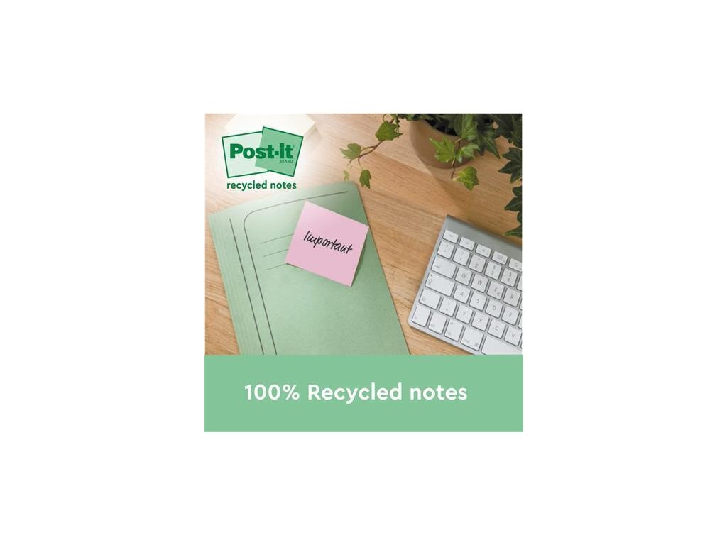 Post-it Nature recyklované bločky jsou vyrobeny ze 100% recyklovaného materiálu - certifikace PEFC RECYCLED. Nebělené. Vícekrát přemístitelné, po odstranění nezanechá stopy.100 listů, 6 bločků