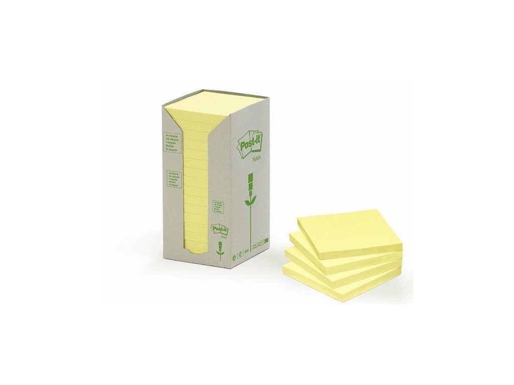 Post-it Nature recyklované bločky jsou vyrobeny ze 100% recyklovaného materiálu - certifikace PEFC RECYCLED. Nebělené. Vícekrát přemístitelné, po odstranění nezanechá stopy.100 listů, 16 bločků