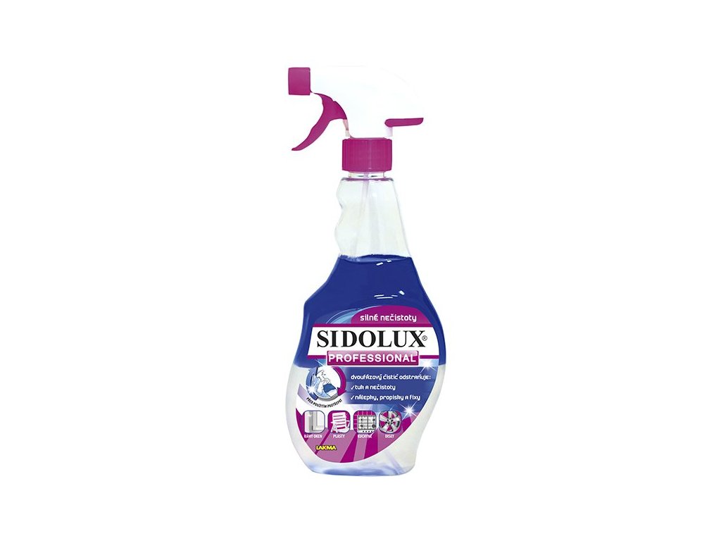 Sidolux Professional na silné nečistoty - DVOUFÁZOVÝ ČISTIČ - 500ML Sidolux Professional na velmi silné nečistoty v podobě tuku, nálepek, propisek a čár od fixů. Jedná se o moderní přípravek pro odstranění silných nečistot. Je určen zejména na mytí okenních rámů, plastového zahradního nábytku, žaluzíí, jízdních kol, skeletů sekaček na trvávu, alu kol u automobilů, motorů a jiných mastnotou znečištěných povrchů. Výborný je také na odstranění lepidel od nálepek, stop od markerů (fixů), barviva apod... Velmi pečlivě čistí také kuchyňské povrchy a to především digestoře, mastné pečící trouby, plasty, skřínky a další omyvatelné povrchy.Speciální moderní receptura přípravku je vhodná na většinu omyvatelných povrchů z plastu, nerezu, lakovaného dřeva, keramiky, skla, PVC, smaltu apod...Modrá fáze: rozpouští nečistoty, dokonale čistí a zabraňuje vzniku šmouh.Bílá fáze: ochraňuje a čištěný povrch a vytváří jakousi impregnaci, která zabraňuje rychlému opětovnému usazení nečištot.Přípravek není určen na mytí a leštění oken, je však vhodný na odstranění nálepek na oknech a zbytků lepidla.Aplikace: před použitím přípravek protřepejte tak dlouho, dokud nevznikne modro-mléčná tekutina, následně aplikujte na čištěný povrch a otřete. Nechte působit jen několik vteřin a případně postup několikrát opakujte. Pokud odstraňujete lepidlo, musíte nechat lepidlo přípravkem rozpustit.Balení 500ML s rozprašovačemVarování Hořlavá kapalina a páry. Způsobuje vážné podráždění očí.