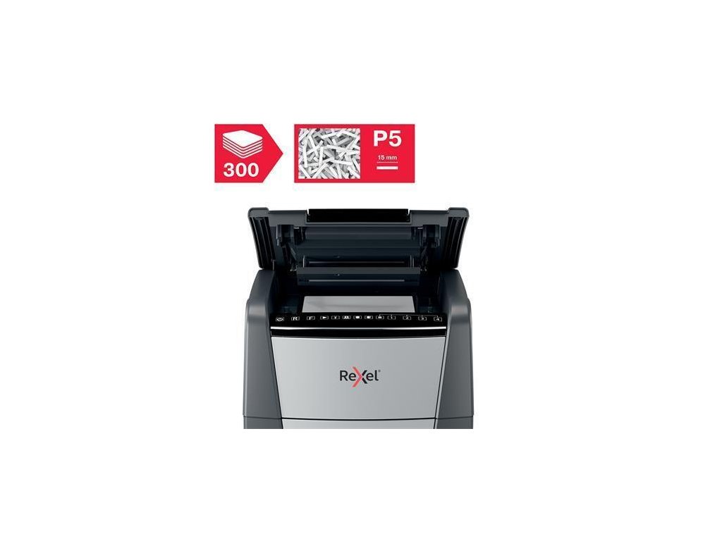 Vysoce výkonný skartovač Optimum AutoFeed+ 300 Pro P5 vhodný pro domácí a kancelářské použitíSkartuje také bankovní karty, kancelářské sponky a drátky sešívaček