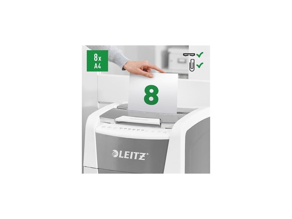 Funkce: technologie proti zaseknutí papíru (automaticky se zastaví a spustí zpětný chod); velkokapacitní odpadní nádoba; skartuje papír, svorky, sponky na papír; dotykové ovládání; mimořádně+ tichý provoz (při dodržování údržby pomocí olejových listů LEITZ).