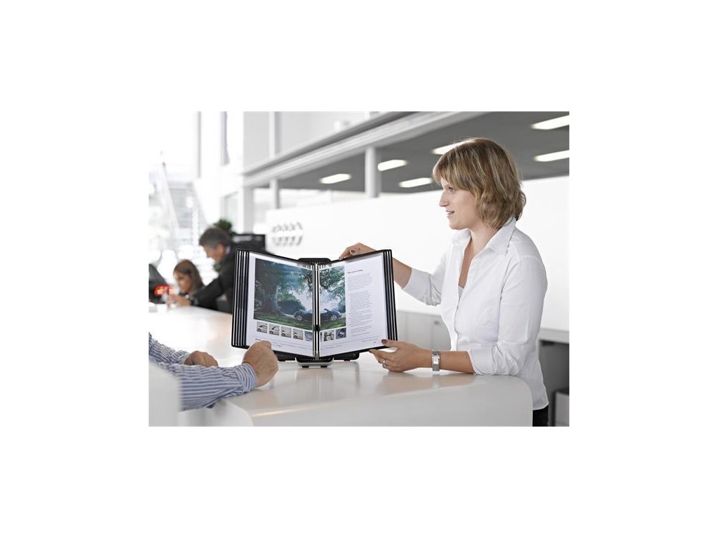 Kompletní stolní prezentační systém ve stylovém designu. Velkolepý tvar se vyznačuje vysoce kvalitními materiály. Rám je z broušeného hliníku, uvnitř je měkký, černý ABS plast. Dá se jednoduše zaklapnout a rozebrat.Balení obsahuje držák a zobrazovací desky. Rám displeje z ocelového drátu potaženého plastem má za následek odolný a zároveň pružný okraj. Díky kovovým otočným čepům jej lze snadno vložit a vyjmout z držáku. Vhodné pro použití v kancelářích a recepcích.
