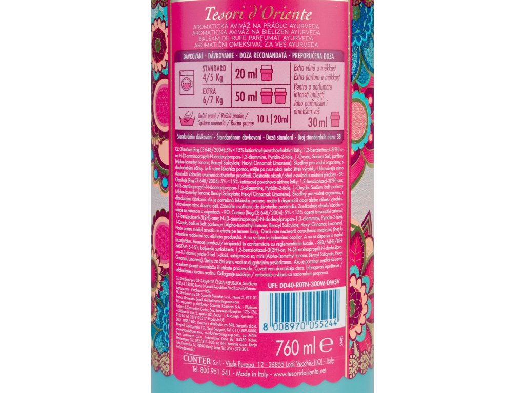 Vůně Ayurveda Amla e Patchouli je složena z jemných citrusových tónů, obohacená o vzácné mikrokapsle parfému. Vůně aviváže Tesori d´Oriente zahalí vaše prádlo a oděvy do smyslného objetí a zanechá je krásně parfémované a měkké. Zahalí vaše prádlo do exkluzivní exotické vůně, nabudí pocit odpočinku a harmonie. Krémové složení bez barviv, se složkami usnadňující žehlení. 38 pracích dávek.