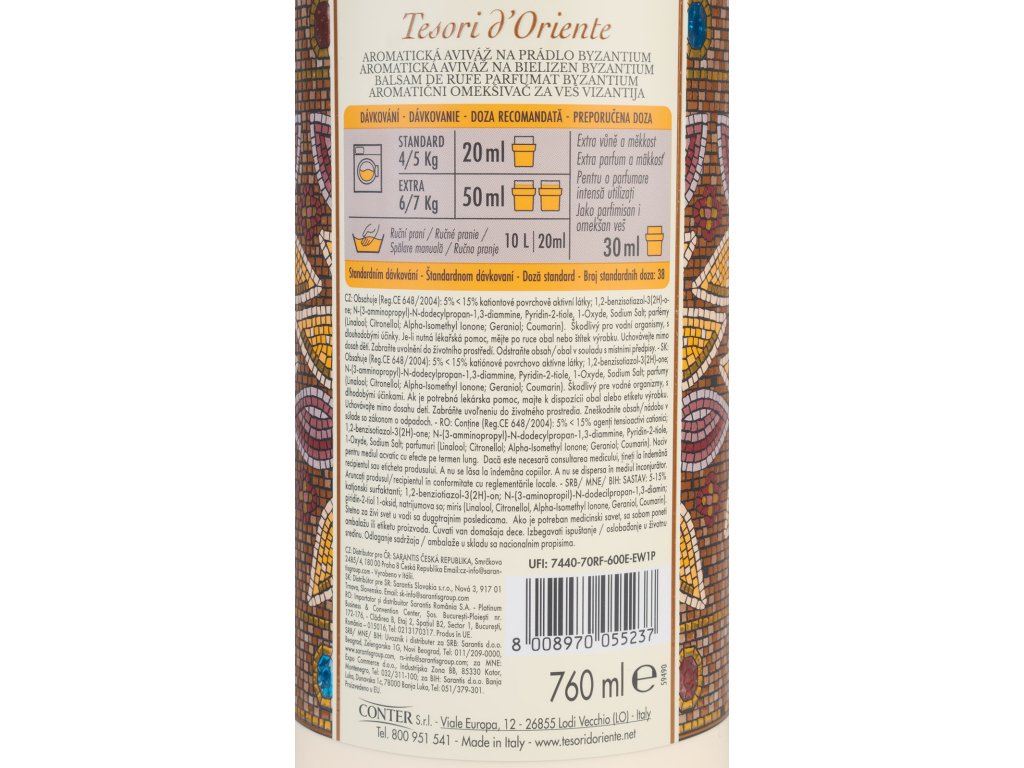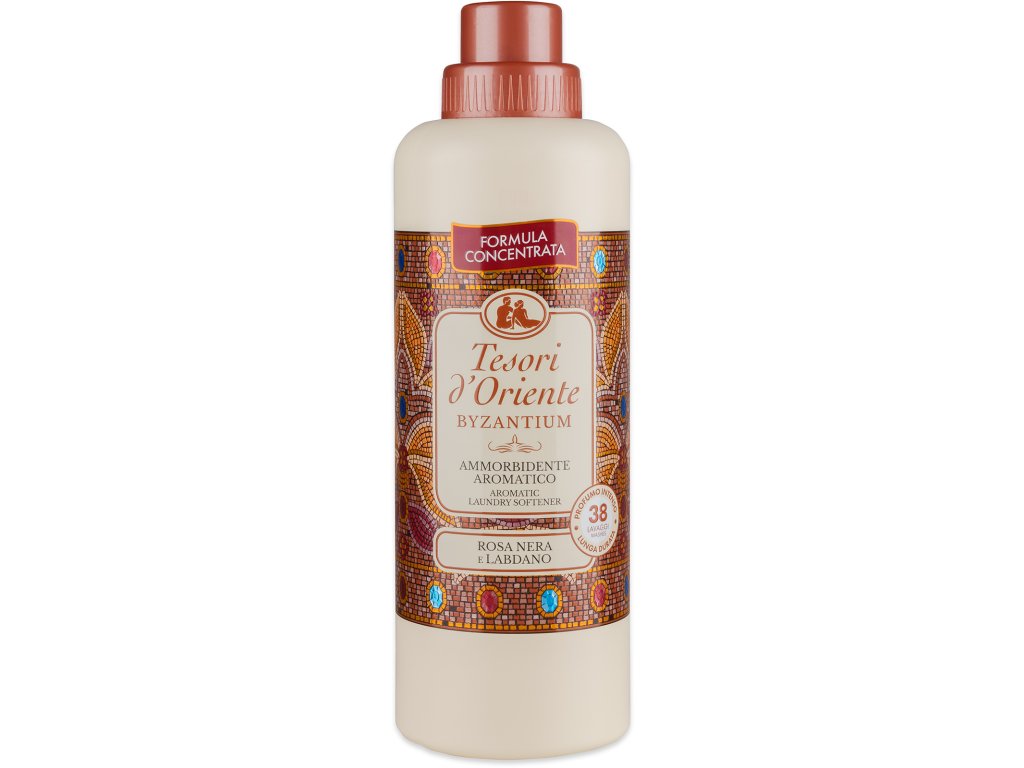 Esenciální olej z nejvzácnější černé růže je hlazen teplými tóny labdanového oleje a dodává prádlu nezaměnitelnou a intenzivní vůni. Vůně aviváže Tesori d´Oriente zahalí vaše prádlo a oděvy do smyslného objetí a zanechá je krásně parfémované a měkké. Aviváž Tesori d´Oriente Byzantium je obohacena o vzácné mikrokapsle parfému. Krémové složení bez barviv, se složkami usnadňující žehlení.