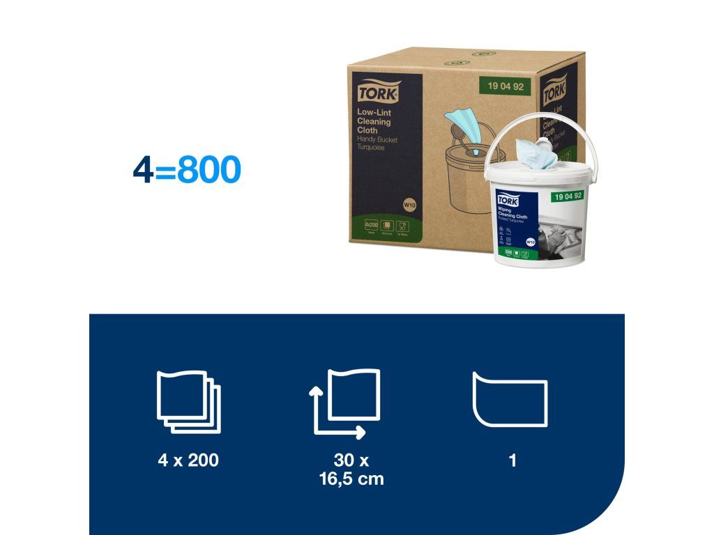 Tork Low-Lint čisticí utěrka je pevná a flexibilní. Utěrky se dodávají jako role v kbelíku, který vám nabízí možnost připravit si své vlastní vlhčené utěrky pomocí chemikálií, které potřebujete. Umožňuje dávkování po jednom útržku a víčko pro snadné otevírání chrání utěrky před vysycháním. Do kbeliku lze zakoupit náhradní náplň- Tork Low Lint průmyslová čisticí utěrka W10.