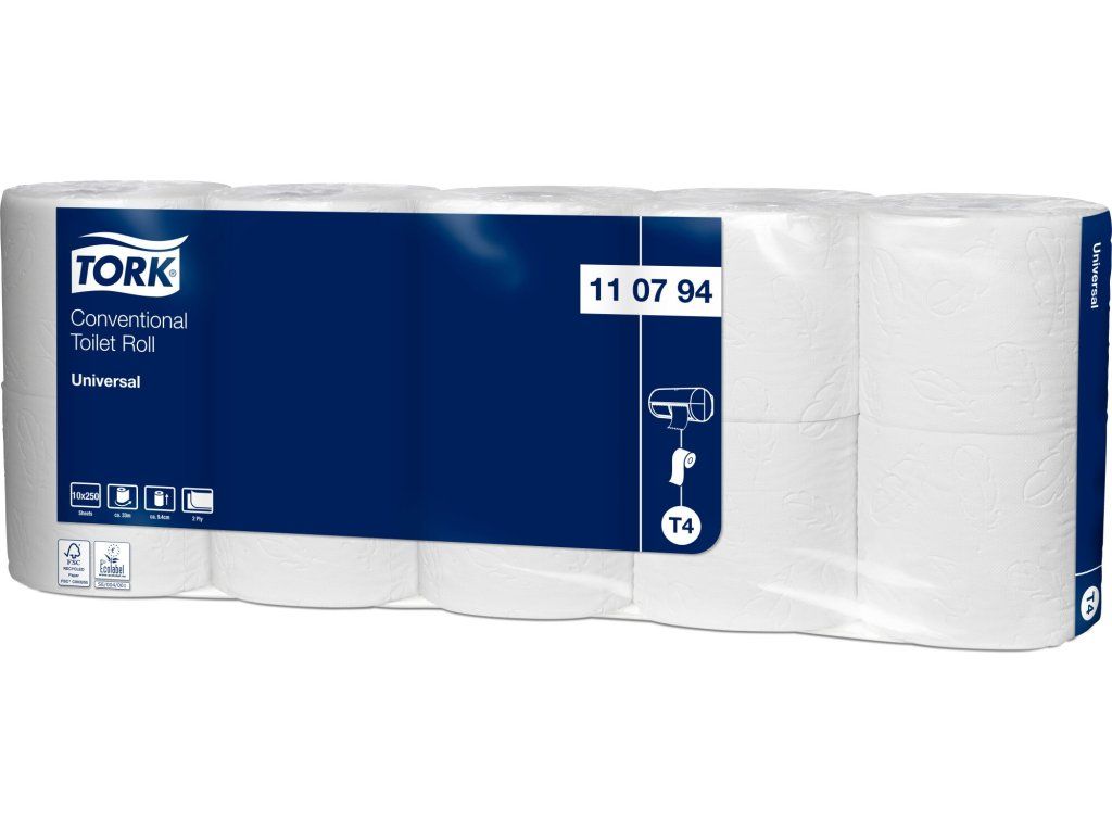 Tork toaletní papír v konvenčních rolích v kvalitě Universal splňuje základní požadavky a pro toalety a umývárny s nízkou návštěvností současně nabízí dobrou kvalitu za přijatelnou cenu. Kompatibilní s Tork zásobníky na toaletní papír konvenční role T4.