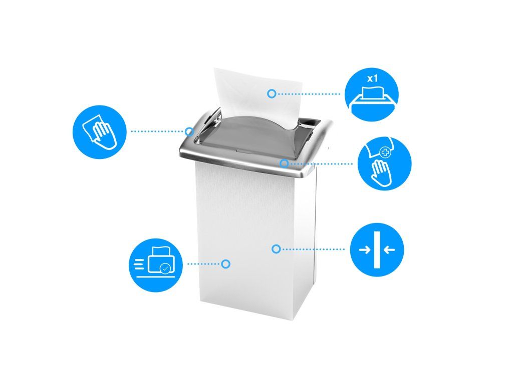 Tento diskrétní zásobník dávkuje ubrousky po jednom, zvyšuje hygienu a v porovnání s tradičními zásobníky na ubrousky snižuje spotřebu minimálně o 25 %.