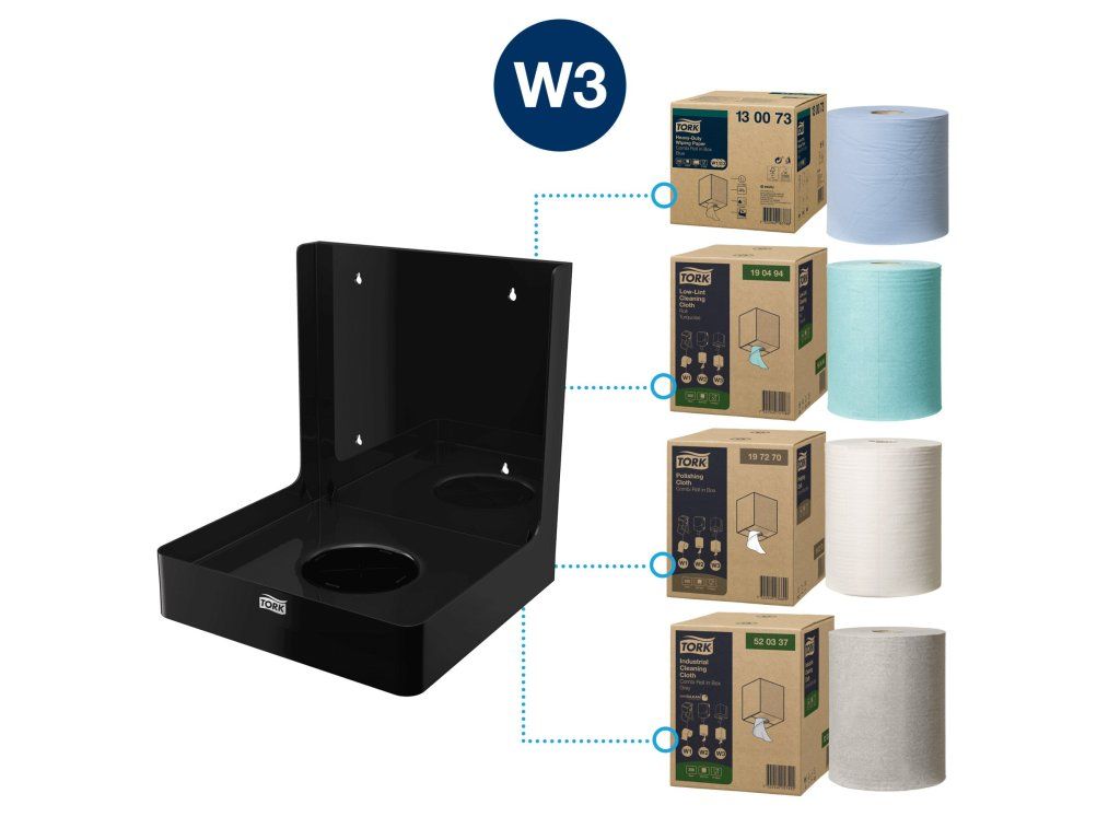 Tork zásobník na kombi role v boxu je jednoduchý otevřený zásobník navržený speciálně pro použití v kombinaci s kombi rolemi v boxu s označením W3.