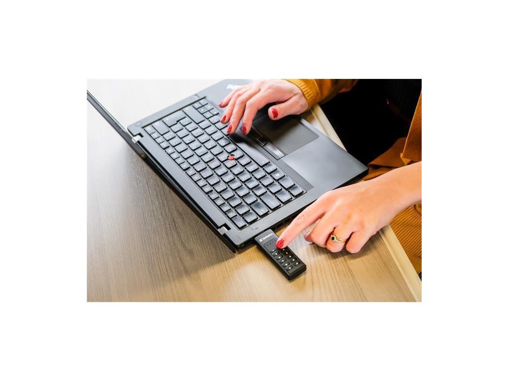 Šifrovaný disk USB s numerickou klávesnicí pro bezpečnost uložených souborů.Vlastnosti: integrovaná klávesnice pro zadávání hesla (až 12 číslic); LED indikátor (nabití, činnosti USB, stav šifrování); kompatibilní s PC i Mac; neukládá heslo do PC ani nestále paměti systému; 256bitové HW šifrování AES (šifruje všechna data na disku v reálném čase); možné použít i s televizí;