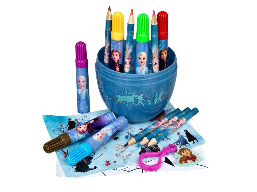 Skvělý nápad na dárek! Tato kreativní sada s motivem Ledového království obsahuje 6 fixů, 6 pastelek, jeden arch se samolepkami (14,7 x 10,5 cm) a plakát (14,7 x 10,5 cm). Uvnitř je skryté také malé překvapení - klíčenka s oblíbenou postavou!Doplňkové parametry