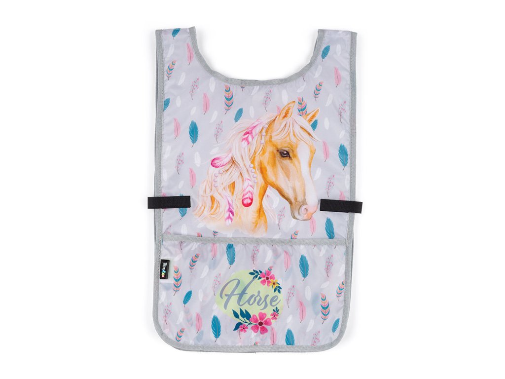 Zástěra pončo do výtvarné výchovy či na jiné tvořící aktivity. Oblékání přes hlavu a po stranách zapínání na druk. Vpředu dvě prostorné kapsy. Materiál 100% polyester.Doplňkové parametry